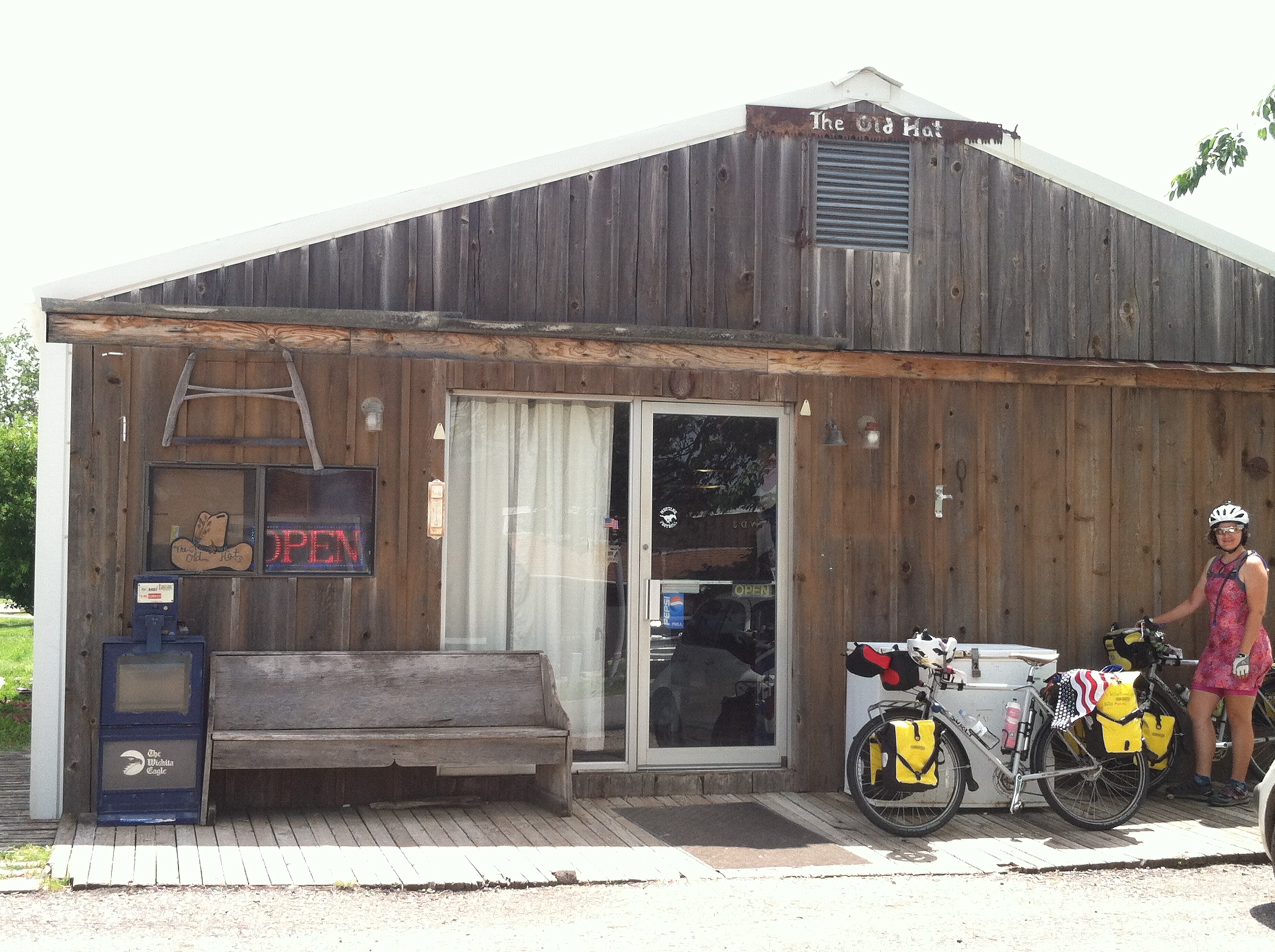 We continued to battle the same cross winds we had the day before and counting down every mile till Rosalia, where we were to turn north. We finally made it to Rosalia and happily accepted the tailwind when we turned. We looked around for a place to eat, as the maps had listed there was a restaurant in this small town. We asked a man at the post office and he said we could see if the “Old Hat” was open and when we got there it was not. We were hungry for some real food, so Phil got out the stove and we cooked our food right there in front of the restaurant.