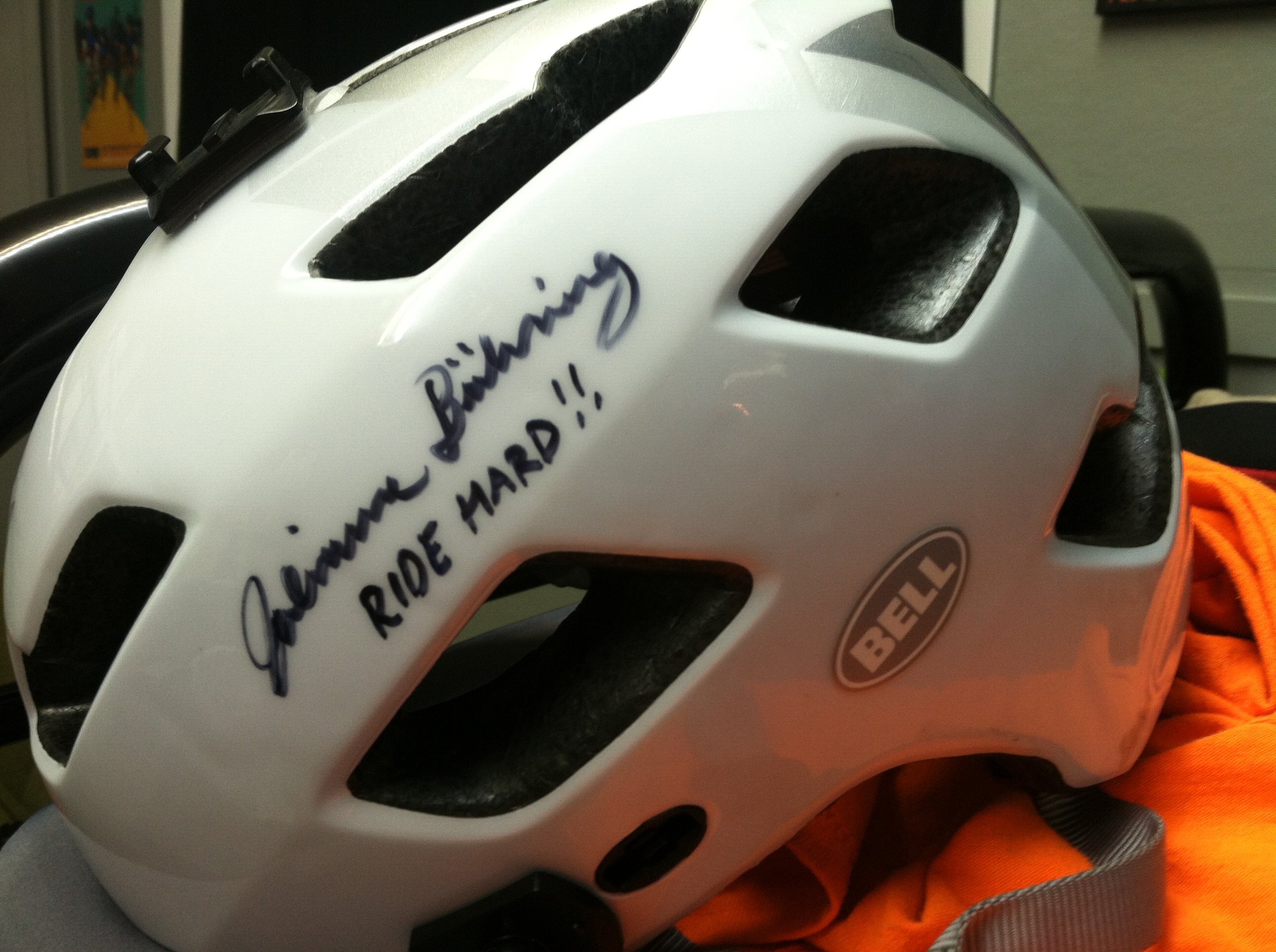 Linda got back in time to help greet the famous Julianna Buhring, who holds the Guinness book of world record for fastest woman to circumvent the world by bicycle. We both got to meet her as well as the 6th place rider who arrived with her. Phil got his picture with her and she signed his helmet.